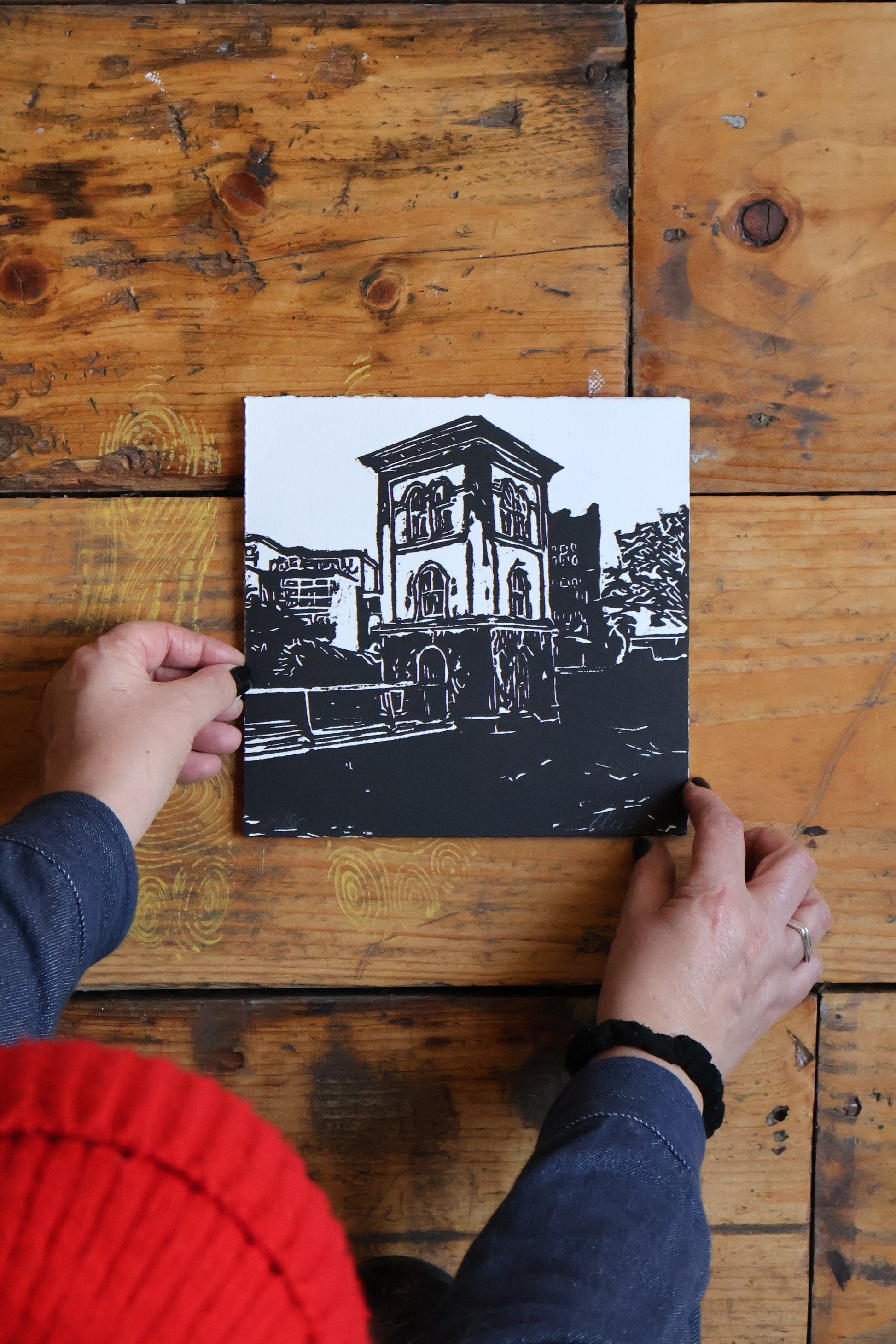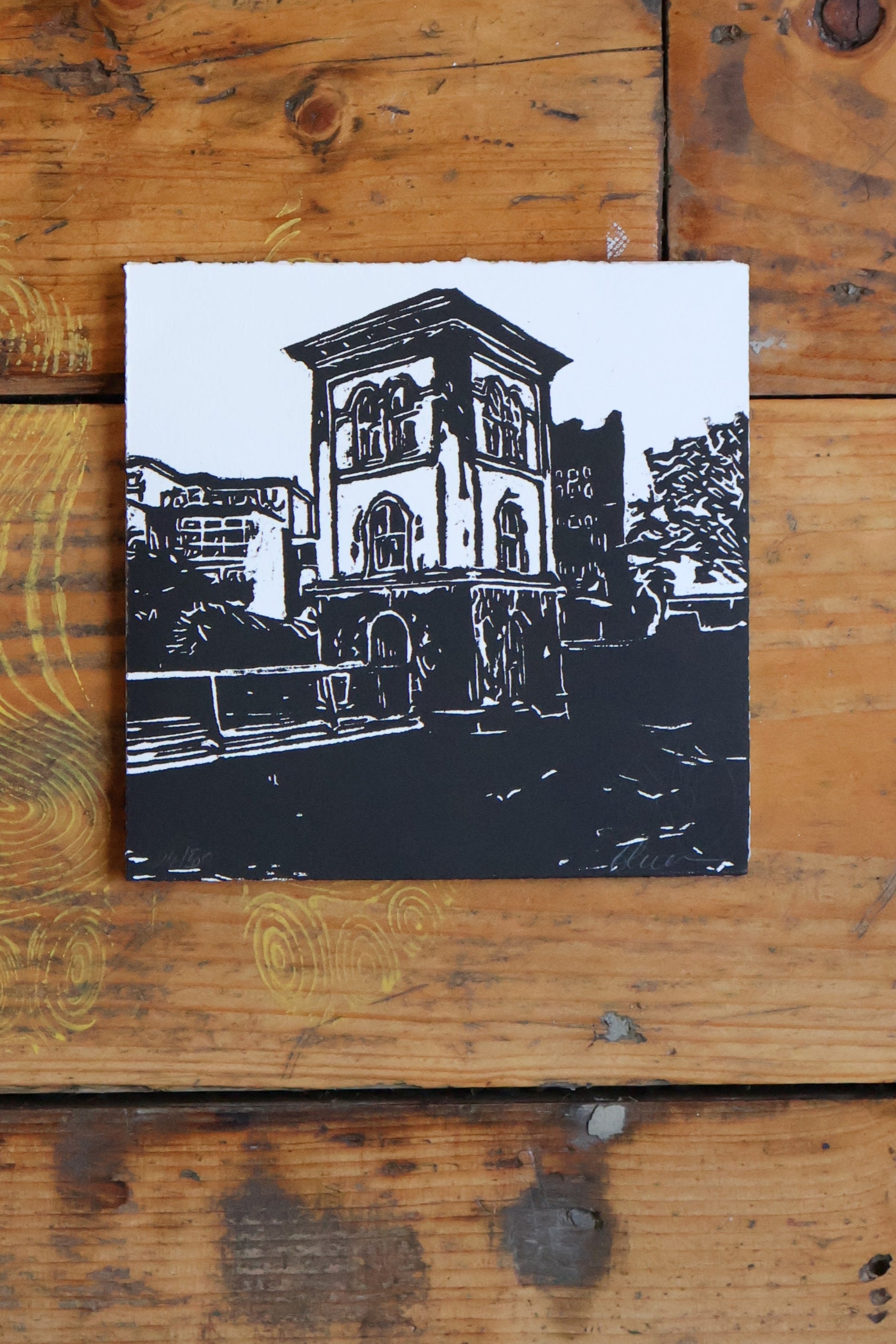 The Galway Fishery Watchtower print is part of a limited-edition woodcut series created by artist Elena Santos in our studio in Galway, 2020. In Ireland, during the COVID-19 lockdowns, we were only permitted to travel within a 2km distance of our homes. This collection of artwork is what emerged from that time for Elena - a visual love letter to Galway´s Westend, the community, and her two precious cats.